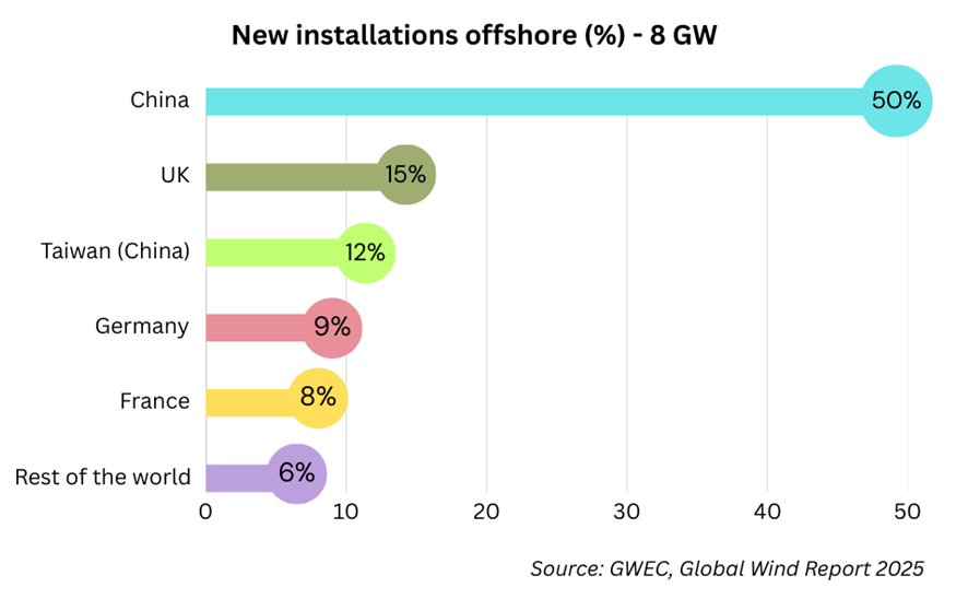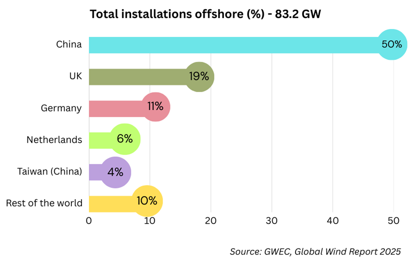 According to the Global Wind Energy Council (GWEC) and the International Renewable Energy Agency (IRENA), the world needs to achieve at least 380 GW of offshore wind capacity by 2030 to stay on track with climate goals. Long-term projections suggest that capacity could exceed 2,000 GW by 2050 if current growth trajectories and supportive policies continue. Currently, over 83.2 GW of offshore wind energy projects are installed across 18 countries, with China, UK, Germany, Netherlands and China leading the way.