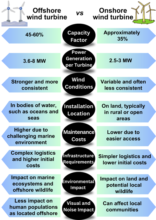 Offshore wind turbines have a higher capacity factor averaging 45-60%, producing approximately 3.6-8 MW per turbine.